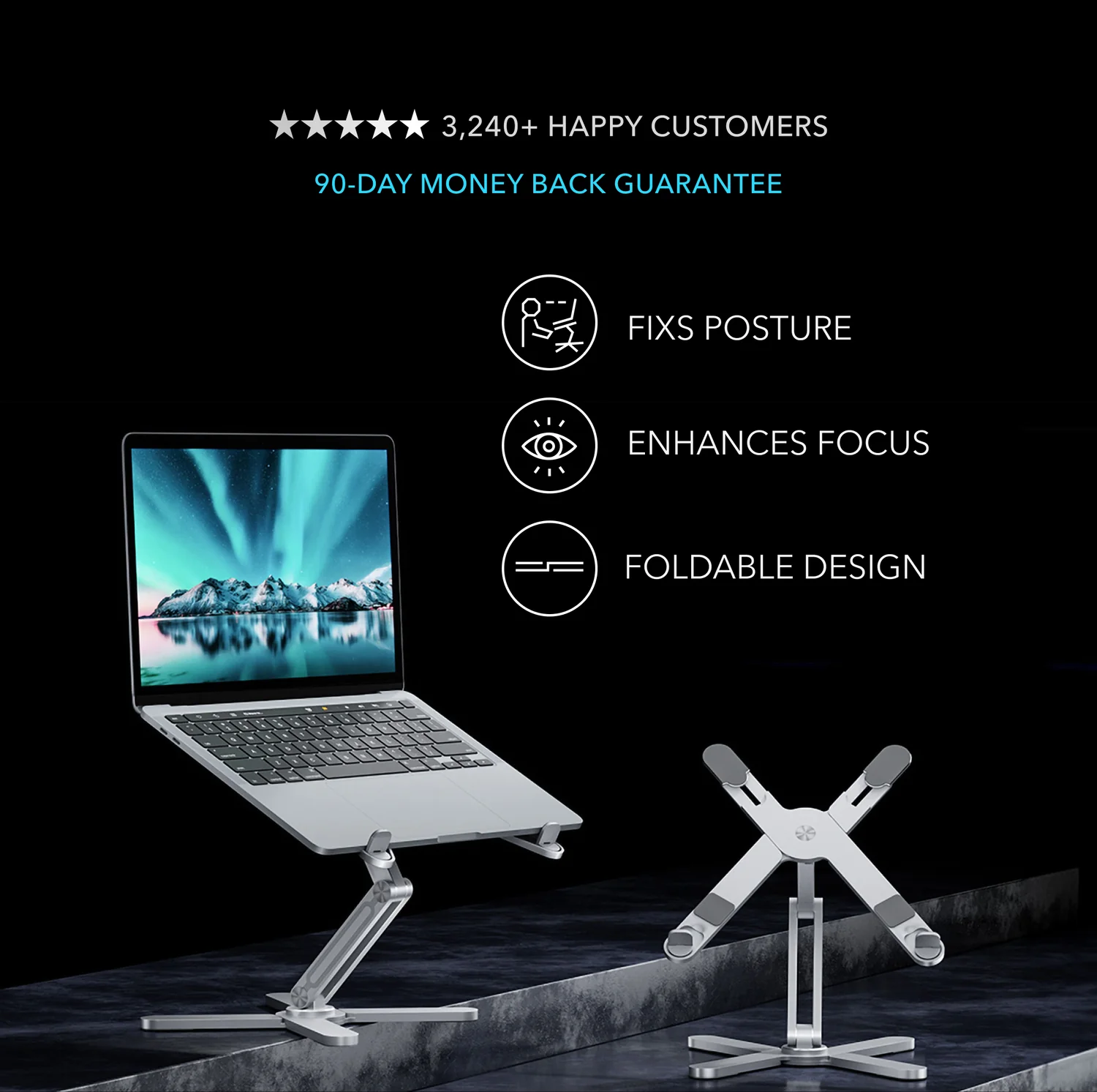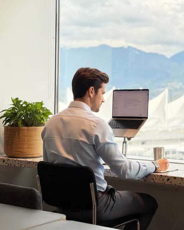 The Model-X elevates your screen to eye level, the scientifically optimal viewing angle that maintains neutral head alignment. When your laptop sits flat, your head tilts forward restricting blood flow to your brain, reducing oxygen by up to 30%. Model-X eliminates slouching so you stay sharp for 6+ hour sessions instead of fading after 90 minutes.