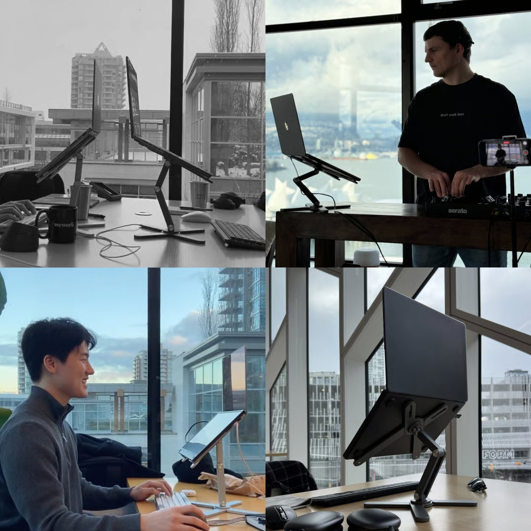 Coffee shop tables. Client offices. Airport lounges. With Model-X, you're no longer at the mercy of your environment...you control it. Adjust to any workspace in 5 seconds. Dial in your perfect viewing angle even on those low cafe tables. You maintain the same optimal setup everywhere, so your performance stays consistent no matter where you work. End your slouch today.