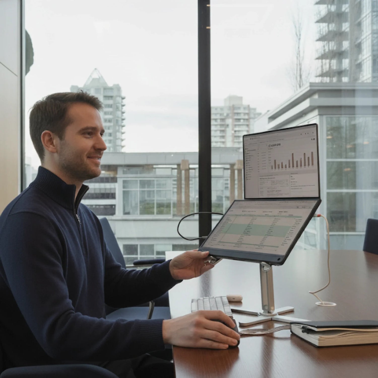 Most stands lock you into one position, forcing awkward laptop pickups during screen shares. Model-X's precision360°rotation lets you share your screen in one fluid motion. People comment on it every time. If you need to flex in a high-stakes environment, this feature immediately shows you're the cool kid.